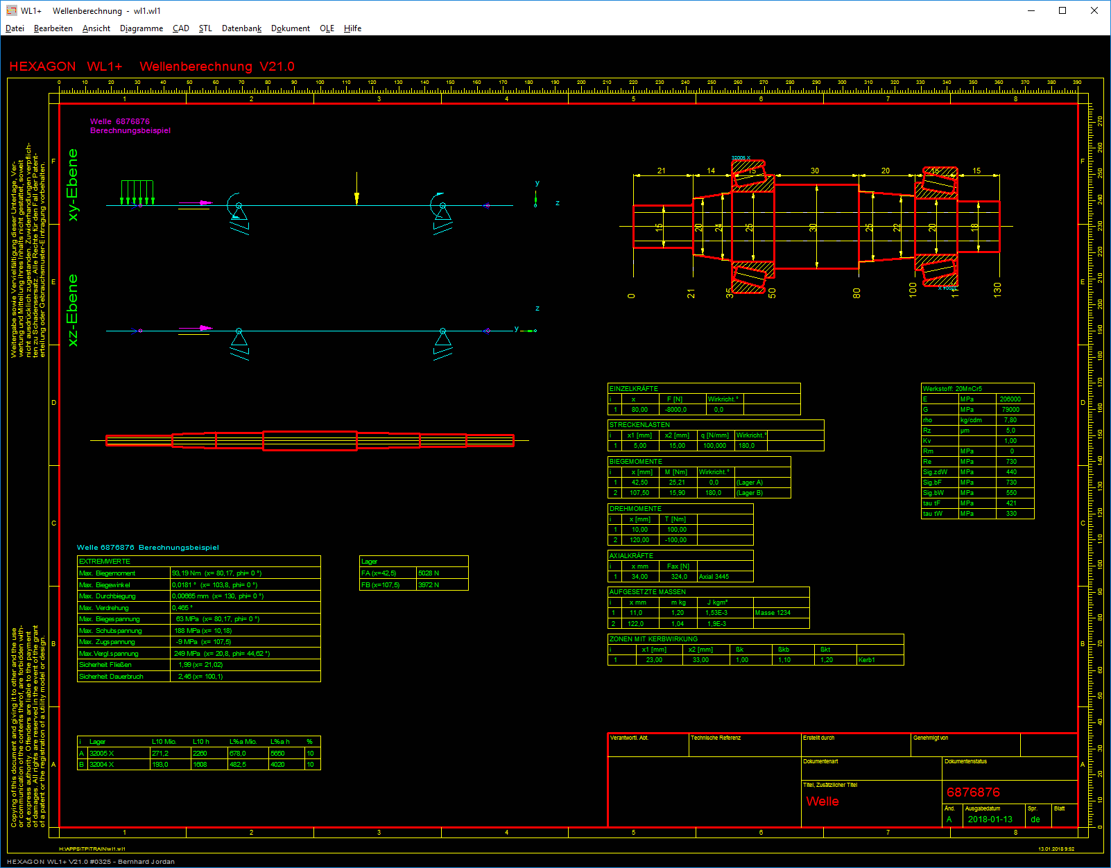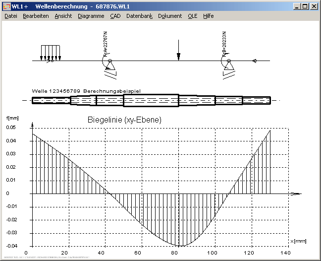 Im Ausdruck erscheinen die Extremwerte von Biegemoment, Biegelinie, Biegespannung, Schubspannung und Vergleichsspannung, zusammen mit Wellengewicht, Massenträgheitsmoment, Schwerpunkt, Auflagerkräften, Biegewinkel in den Lagerstellen, Lagerlebensdauer, kritischen Drehzahlen, Werkstoffkennwerten und allen Eingabedaten.