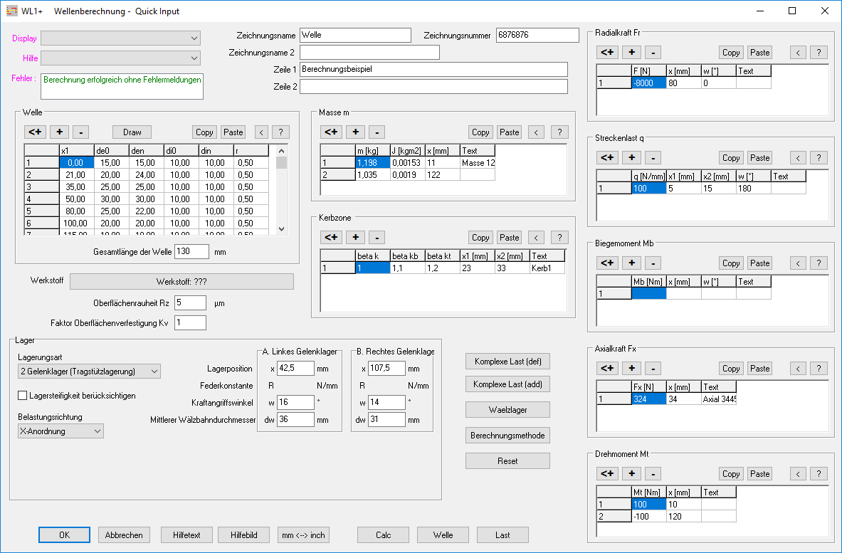 In der Quick-Eingabe kann man Wellenabmessungen, Lagerung, Werkstoff, Kräfte, Streckenlasten, Biegemoment, Drehmoment in einem Dialogfenster eingeben.
