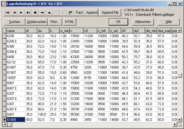 Anhand der Werte von berechneter Auflagerlast und Tragzahlen können Sie aus der mitgelieferten Datenbank ein geeignetes Lager wählen, WL1+ berechnet daraus die Lagerlebensdauer nach DIN.