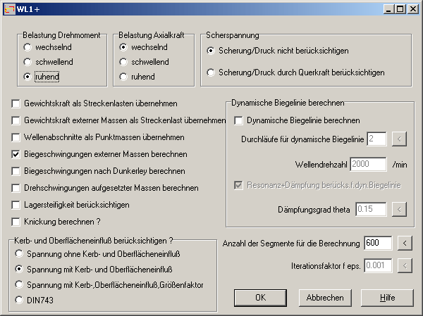 Die Welle kann aus bis zu 100 zylindrischen oder konischen Wellenabschnitten bestehen. Als Belastung können bis zu 50 Einzelkräfte, Streckenlasten, Biegemomente, Drehmomente und Axialkräfte aufgegeben werden. Belastungen durch Zahnradgetriebe rechnet WL1+ in Streckenlasten, Axialkraft, Dreh- und Biegemoment um. Die komfortabelste Art der Eingabe ist die direkte Übernahme der Getriebekräfte