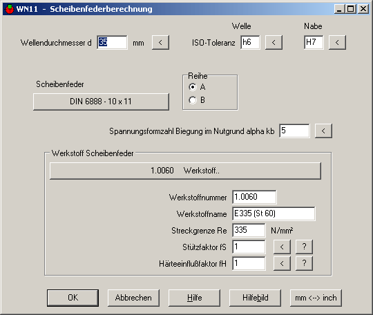 Die WN11-Software berechnet die Tragfähigkeit einer Scheibenfederverbindung nach DIN 6892. Diese Norm für Paßfedern ist auch für Scheibenfedern verwendbar, wenn statt tragender Länge und tragender Höhe mit den tragenden Flächen von Wellennut, Nabennut und Scheibenfeder gerechnet wird.