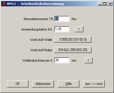 In der Vorauslegung können Sie aus Nenndrehmoment und Werkstoffdaten den erforderlichen Wellendurchmesser berechnen lassen, und eine geeignete Scheibenfeder aus der Datenbank wählen.