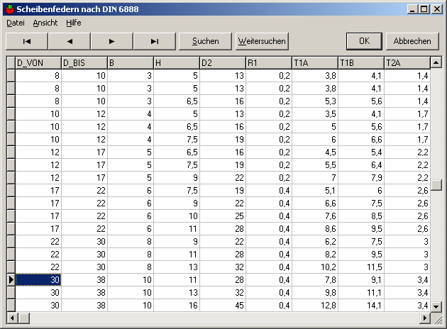 Zum Lieferumfang von WN11 gehört eine Datenbank, die alle Abmessungen von Scheibenfedern nach DIN 6888 enthält. Die Datenbank kann vom Anwender modifiziert und erweitert werden.