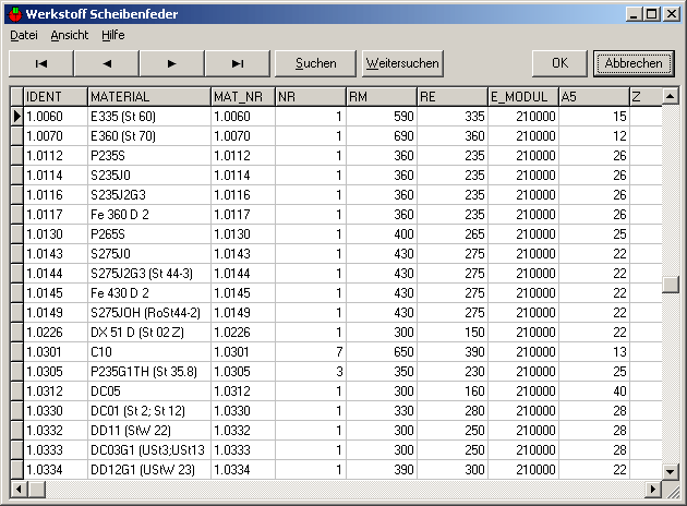 Die Werkstoffe für Welle, Nabe und Paßfeder können aus der integrierten Datenbank gewählt werden.