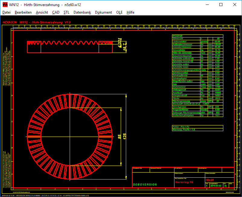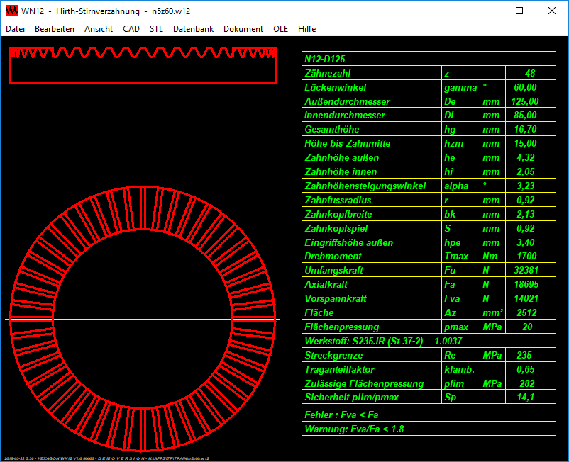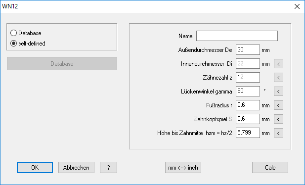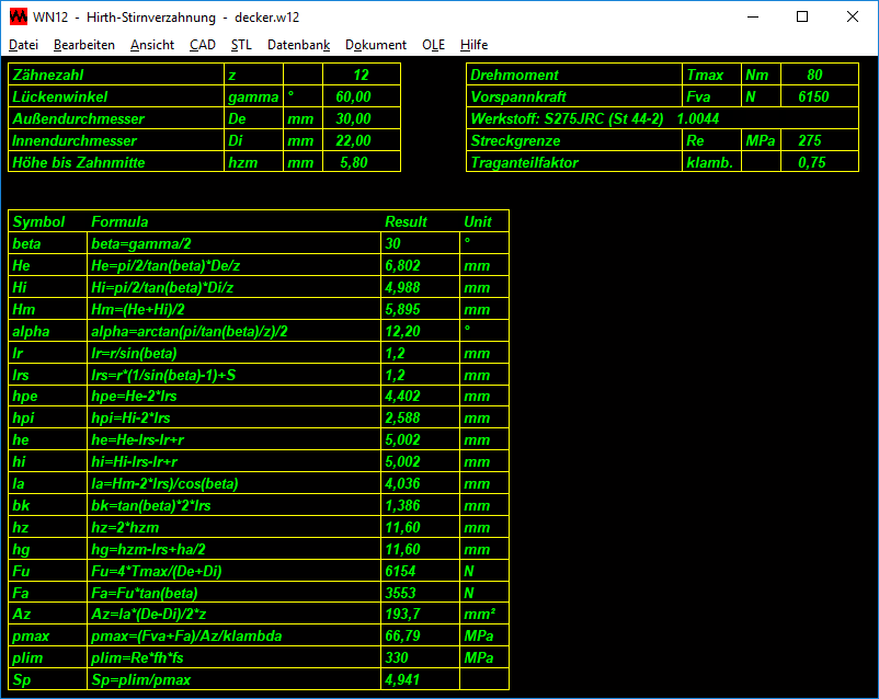 Die WN12-Software berechnet die Abmessungen von Stirnverzahnungen (Hirth-Verzahnungen). Berechnet werden nicht nur Verzahnungen mit dem üblichen Zahnlückenwinkel von 60°. Außer Außendurchmesser, Innendurchmesser, Zähnezahl, Fußausrundungsradius und Zahnkopfspiel kann auch der der Zahnlückenwinkel eingegeben werden.