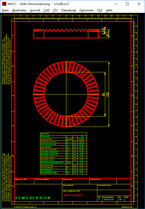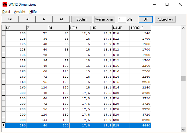 Die mitgelieferte Datenbank enthält übliche Normringe mit Hirth-Verzahnung und Außendurchmesser von 50 mm bis 900 mm. Die Datenbank kann vom Anwender modifiziert und erweitert werden.