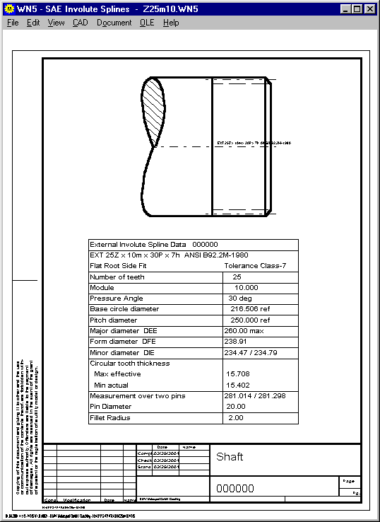 Drawing tables with spline dimension data according to ISO 4156 or ANSI B92.2M together with a spline draft may be printed or loaded with CAD via DXF-/IGES interface.