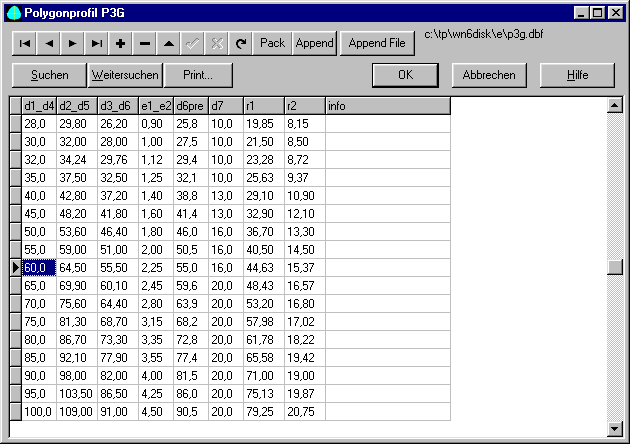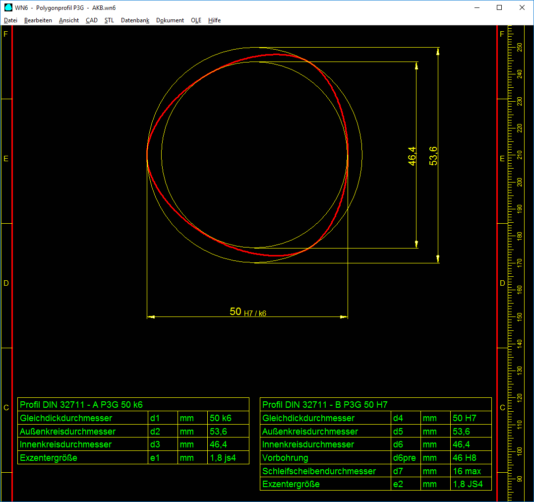 Zeichnungstabellen mit Profilzeichnung nach DIN 32711 können ausgedruckt oder per DXF-/IGES-Schnittstelle in CAD übernommen werden.
