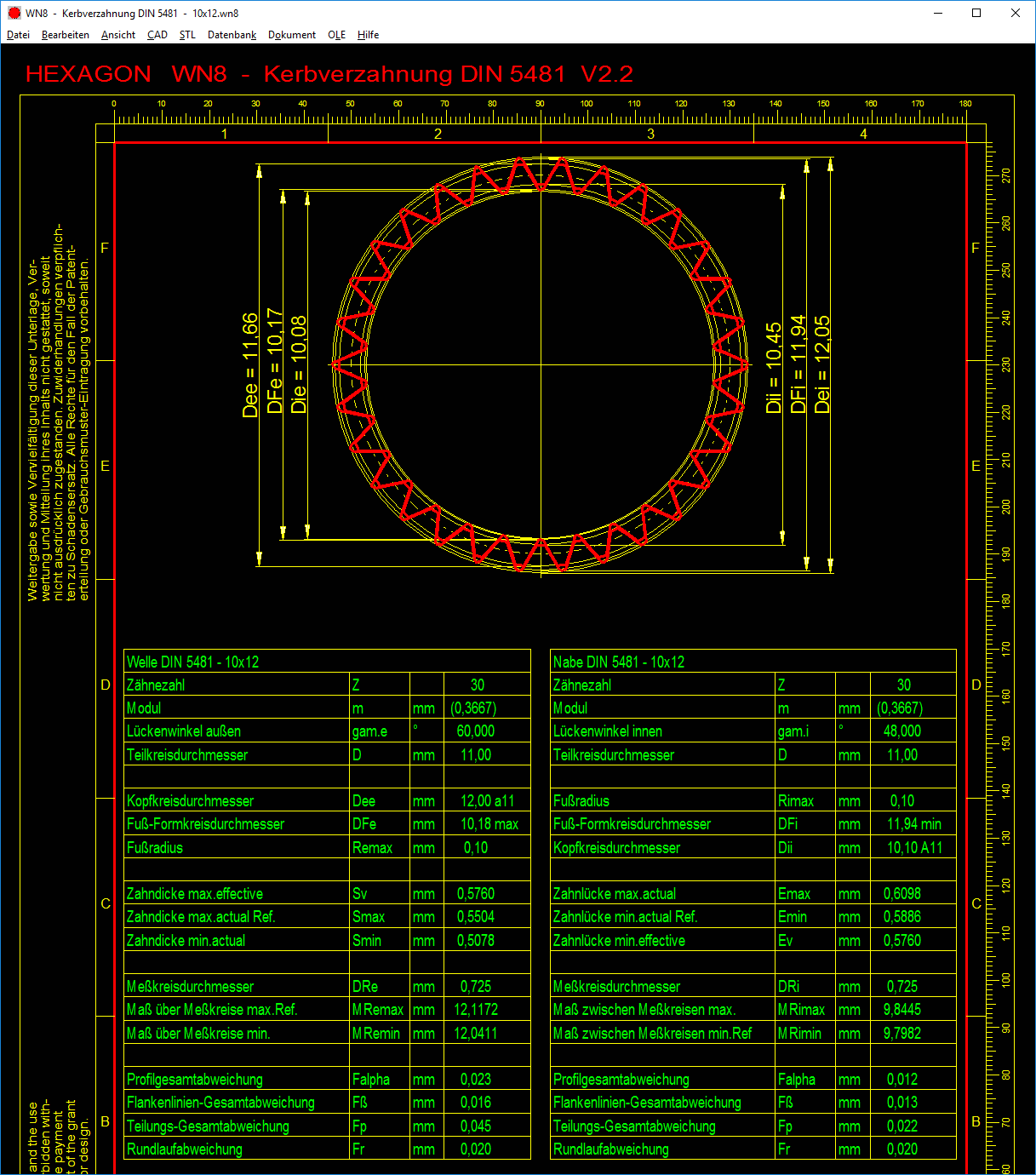 WN8 generiert eine maßstäbliche Zeichnung des Zahnprofils von Zahnwelle und Zahnnabe, die Sie direkt in CAD übernehmen können. Außerdem Tabellen mit den Abmessungen (mit oder ohne Prüfmaße) und Toleranzen.