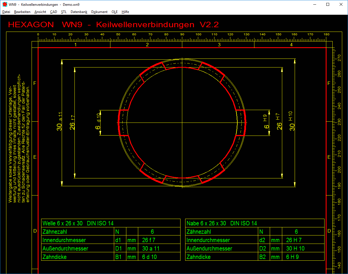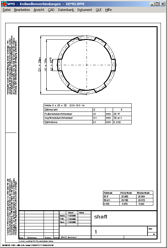 WN9 generiert eine maßstäbliche Zeichnung des Zahnprofils von Zahnwelle und Nabe, die Sie direkt in CAD übernehmen können. Außerdem Tabellen mit Abmessungen und Toleranzen.