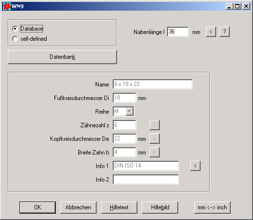 Die mitgelieferte Profildatenbank enthält alle Normgrößen nach DIN ISO 14, DIN 5471, DIN 5472 und DIN 5464. Die Werkstoffdatenbank enthält die benötigten Kennwerte der wichtigsten Stähle. Die Datenbanken können vom Anwender nach Belieben erweitert werden.