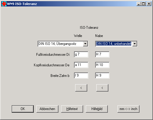 ISO-Toleranzen für Gleitsitz, Übergangssitz oder Festsitz nach DIN ISO 14, DIN 5471 oder DIN 5472 kann man sich vom Programm vorschlagen lassen oder selber eintragen. Die Abmaße werden von WN9 berechnet.