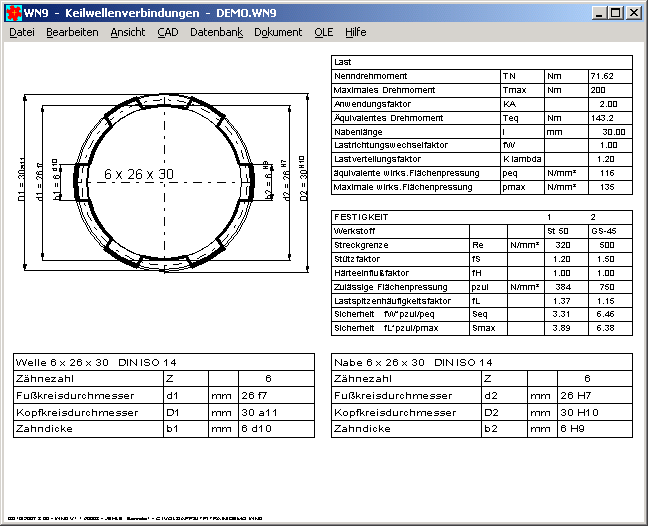 Aus Drehmoment, Material- und Anwendungsdaten berechnet WN9 Sicherheiten gegen Überschreitung der zulässigen Flächenpressung.