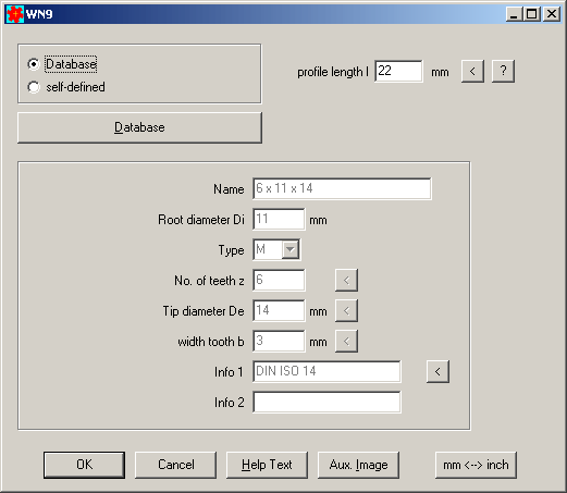 Integrated profile database includes standard sizes of DIN ISO 14, DIN 5471, DIN 5472, DIN 5464 and SAE J499a. Material database includes material data of most essential steel materials. All database files may be modified and extended by the user.