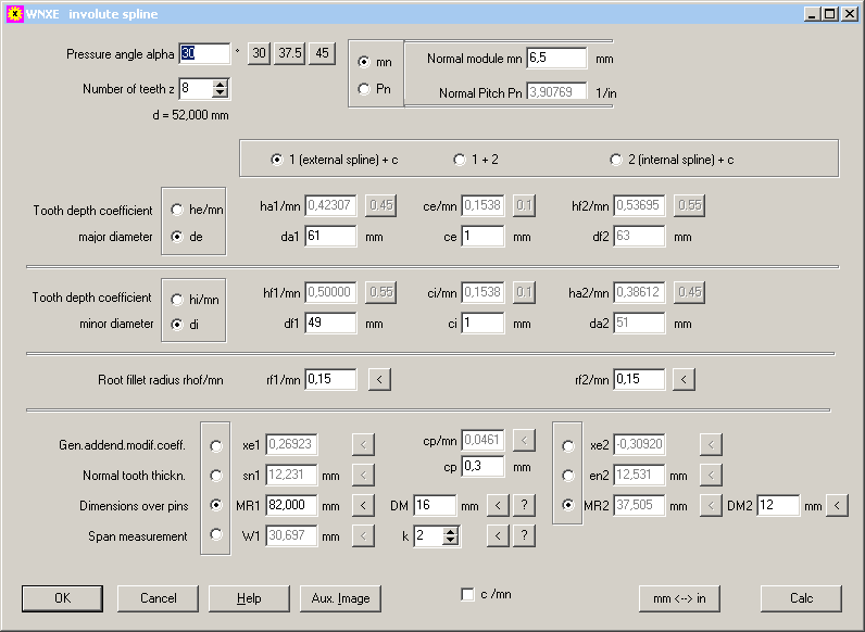 WNXE can calculate dimensions of involute splines (without tolerances) according to any standard, if the most essential dimensions are known or measured. WNXE calculates involute splines to ISO 4156, DIN 5480, ANSI B92.1, DIN 5482, DIN 9611. Even JIS splines with 20 deg pressure angle and large profile shift.