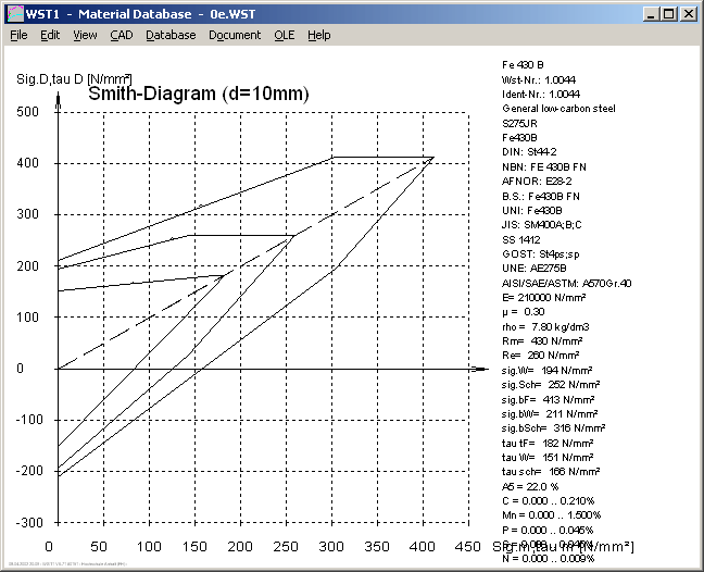 Technical data, strength values, alloy components, properties and utilization data for steels and NE metals are available in WST1. WST1 creates an extension-expansion diagram as well as fatigue stress diagrams for tension/pressure, bending and torsion.