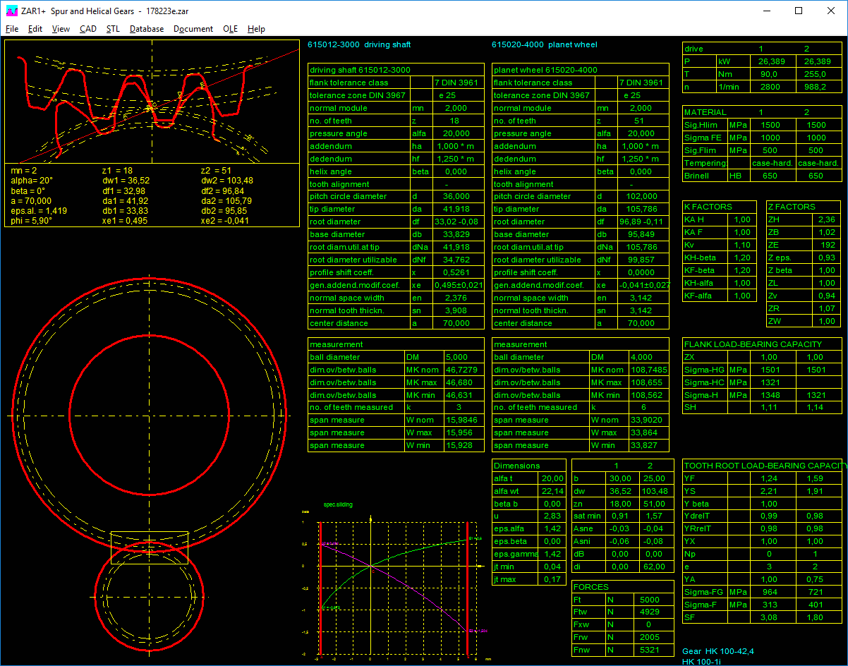 DXF and IGES interfaces allow ZAR1 to be linked to CAD and DTP systems. ZAR1 generates drawings of the front and side elevation of the gears calculated, plus tables containing the