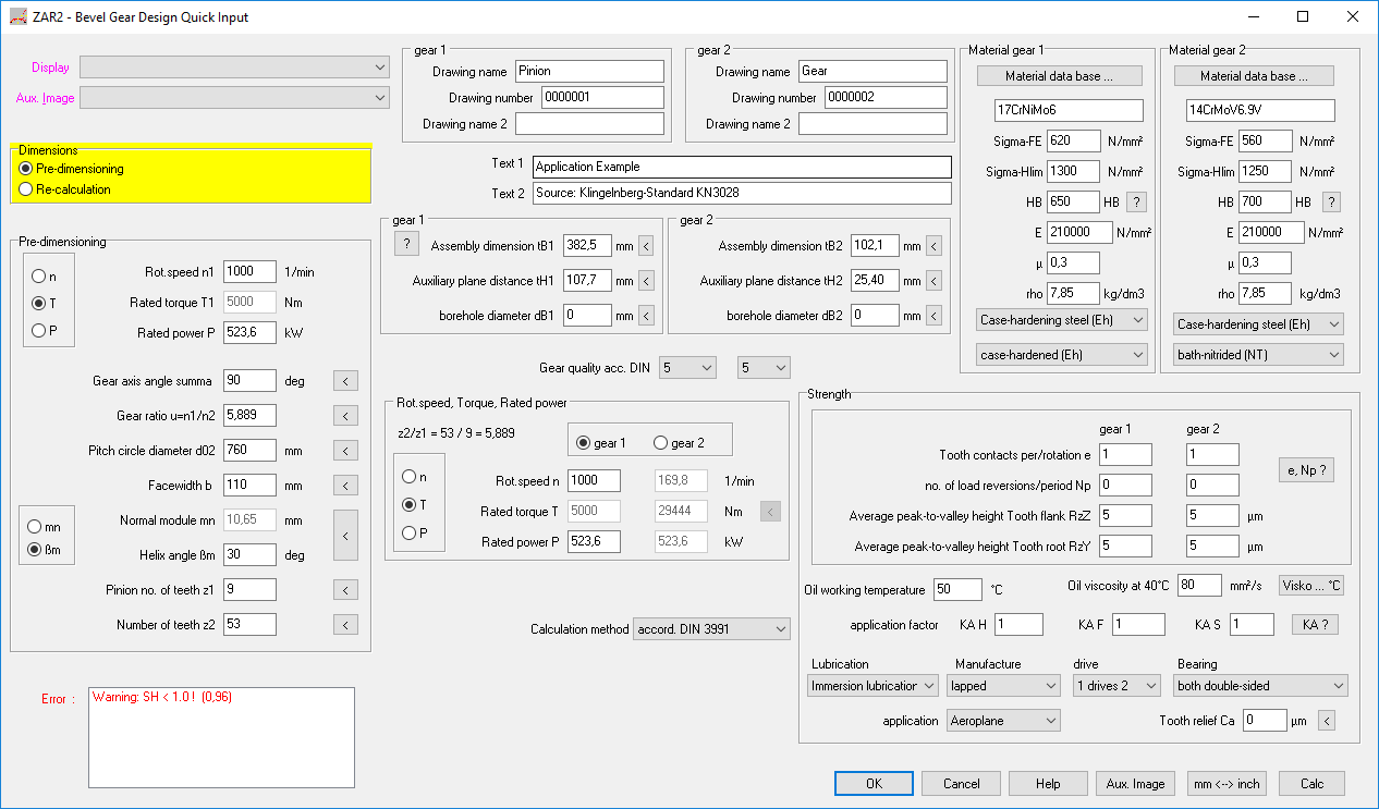 In pre-dimensioning ZAR2 makes recommendations for the size of the bevel wheel, face width, modulus and number of teeth based on the axes angle, gear ratio, pinion speed and torque.