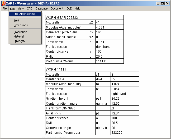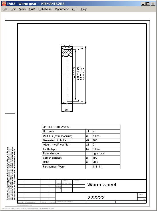 A true-scale drawing of worm and worm wheel, as well as tables with the gear data can be exported to CAD via the DXF or IGES interfaces. The drawings can of course also be displayed on screen and printed out.