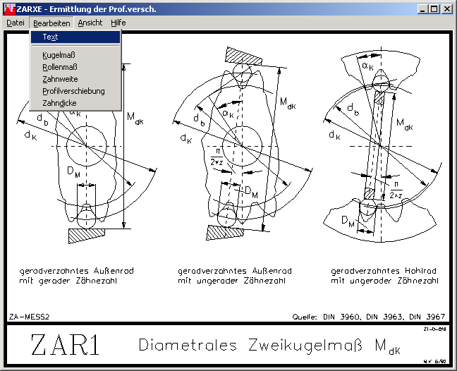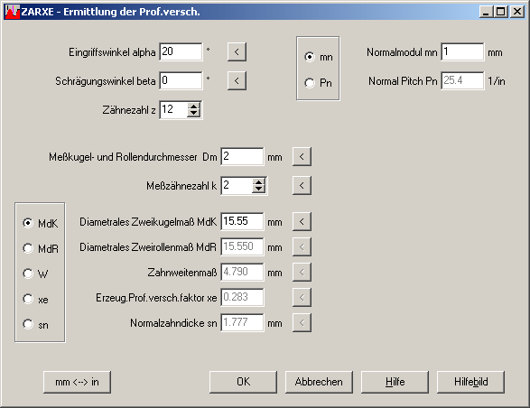 ZARXE ist auch geeignet für die Umrechnung von Kugelmaß, Rollenmaß, Zahnweite, Zahndicke und Profilverschiebungsfaktor, wenn nur eine dieser Größen bekannt ist.