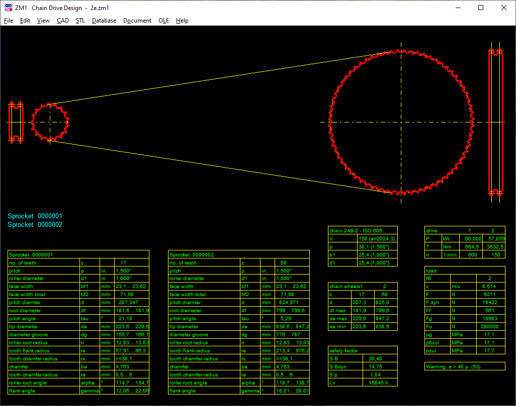 ZM1 searches the data base and suggests an appropriate chain based on transmission ratio, power and drive speed. ZM1 determines the next even number of links for the chain and calculates the exact dimensions based on the approximate center distance.