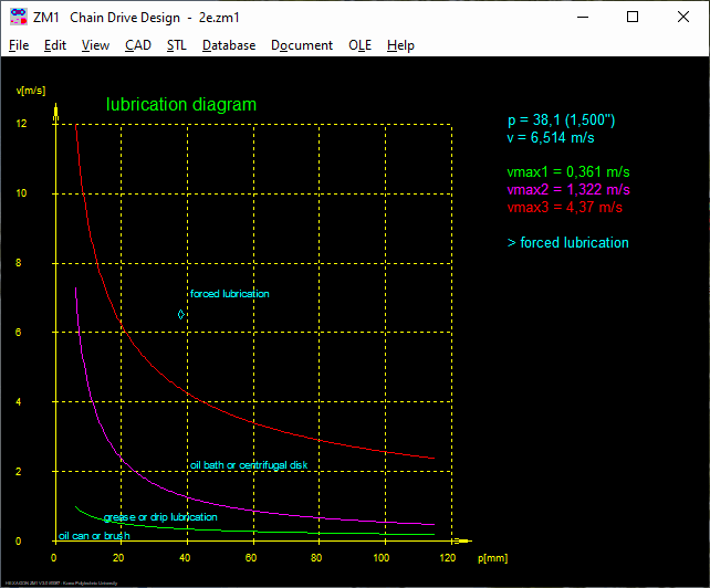 ZM1 determines the recommended type of lubrication from the diagrams for selecting type of lubrication (according to Niemann). The operation point of the calculated gear is shown in the chart.