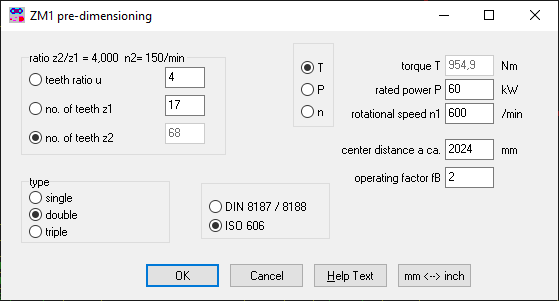 The required chain is selected from the data base. ZM1 calculates the dimensions for chain and sprockets from the number of teeth of the sprockets and of the approximate center distance.
