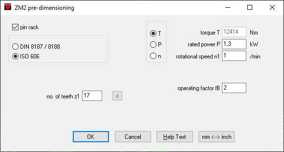ZM2 calculates dimensions of sprocket and pin rack according to ISO 606. Sprocket is calculated by means of maximum chain force to ISO 606. Roller chain equivalent profiles can be selected from the data base provided.
