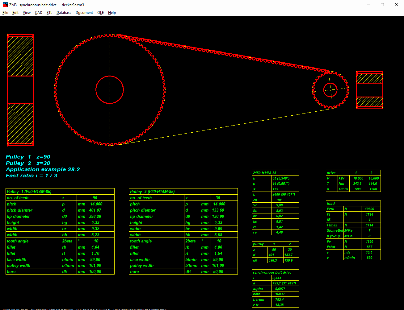 ZM3 calculates tangential force and permissible belt load and belt stress.