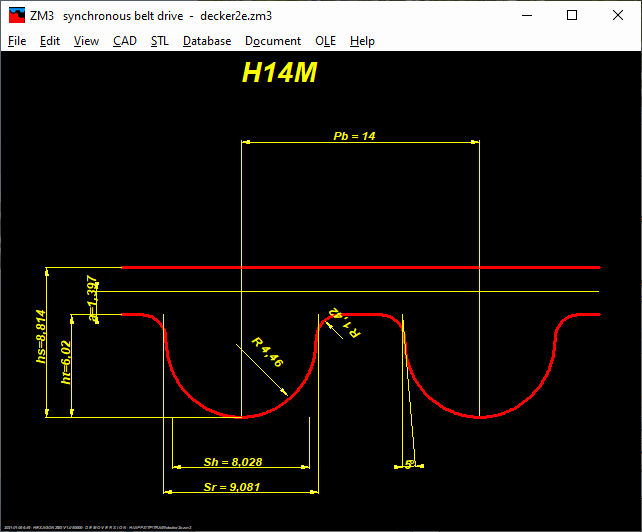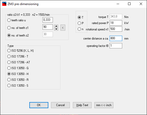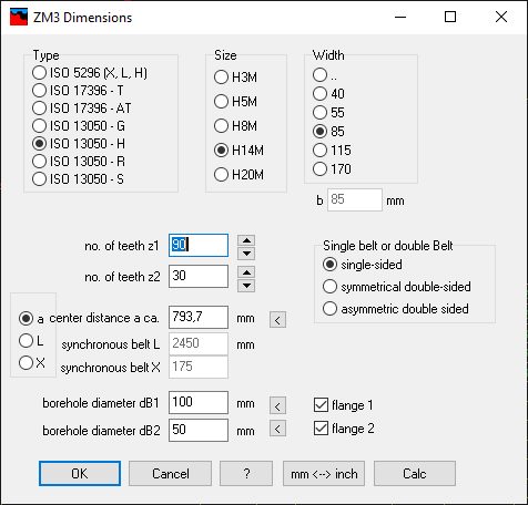 ZM3 calculates dimensions of synchronous belt drives according to ISO 5296 (MXL, XXL, XL, L, H, XH, XXH), ISO 17396 (T und AT), ISO 13050 (G, H, R, S).