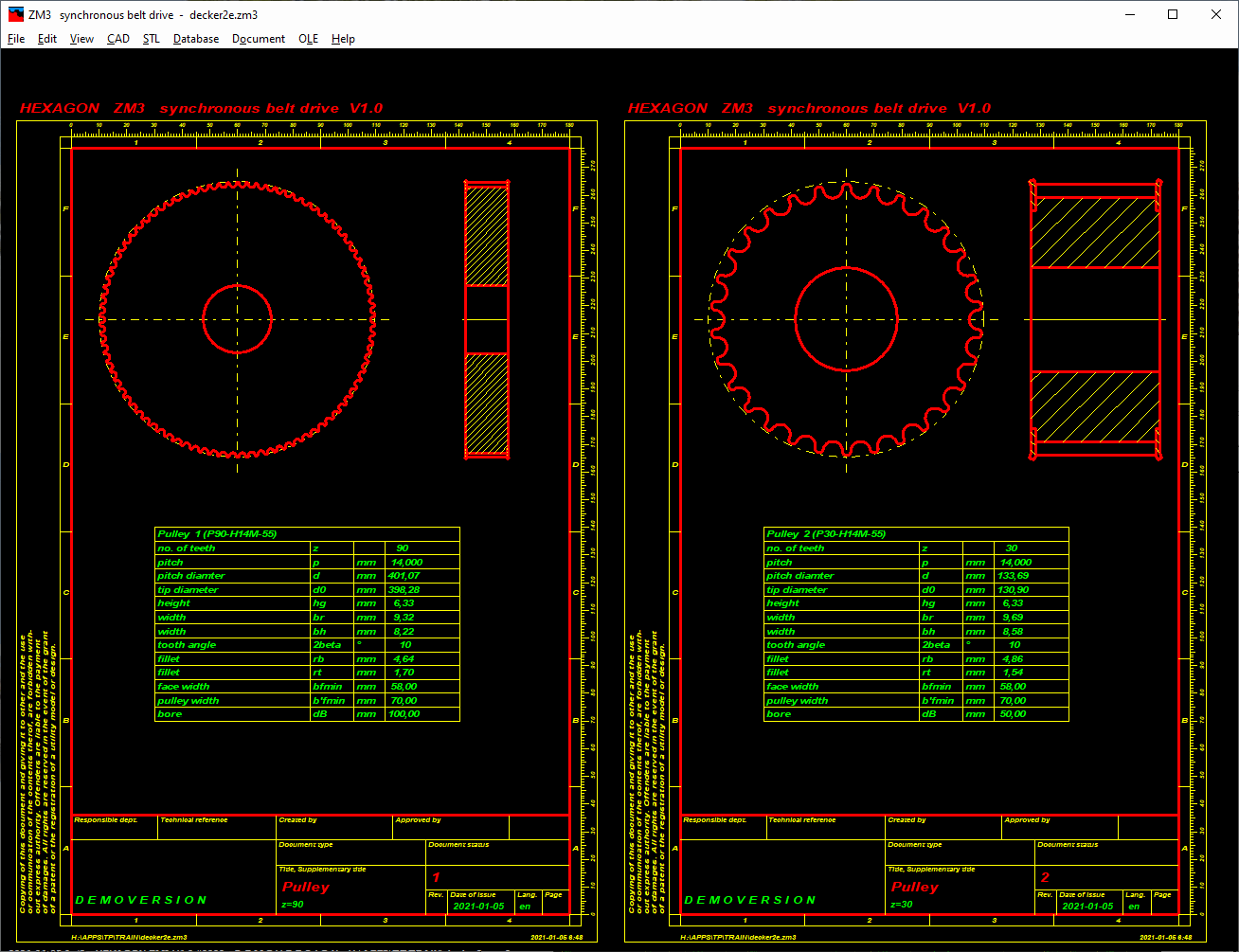 ZM3 generates production drawings of the pulleys. The drawing includes a header to ISO 7200 and an index of alterations taken from the program.